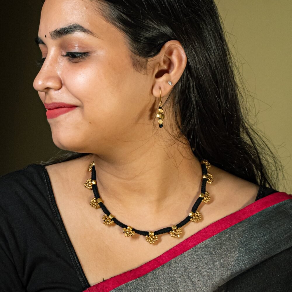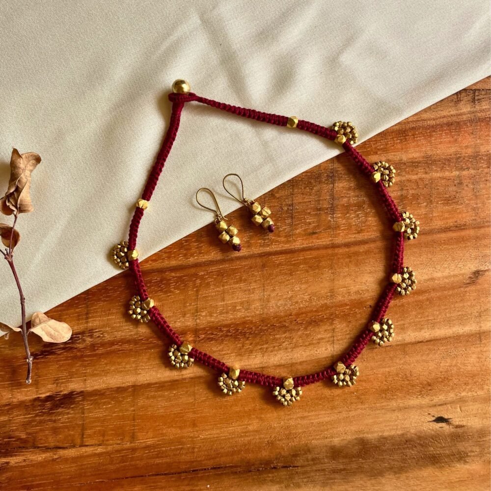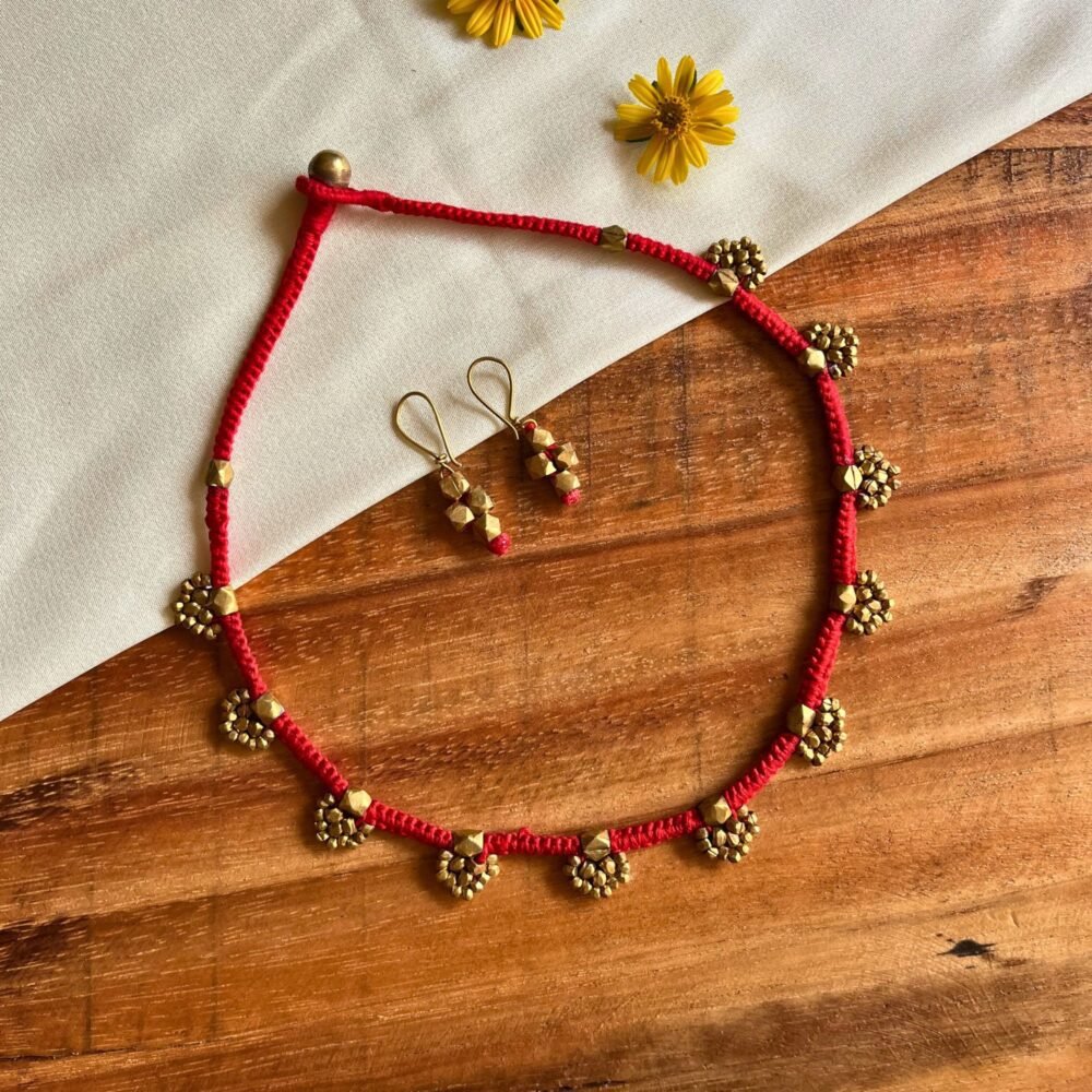 “Discover this stunning Dhokra Brass Necklace & Earrings, handcrafted by Jaya, an Adicrafts artisan from Odisha. Made using traditional lost-wax metalwork combined with cotton threads, each bead is carefully shaped by hand through the 4,000-year-old techniques of wax carving, clay moulding, and molten brass casting. More than just jewellery, it celebrates Odisha’s rich heritage and supports skilled artisans.”